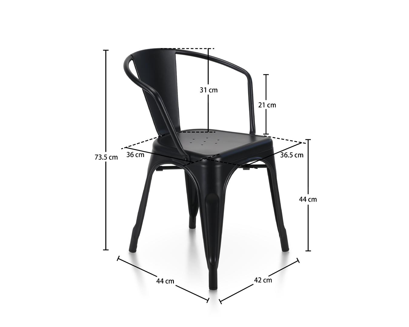 • Kerusi ini adalah karya reka bentuk perindustrian, yang dibuat dari besi berkualiti tinggi dan selesai dengan warna hitam yang anggun yang memancarkan keanggunan. Perhatian terhadap perincian dalam pembinaannya terbukti dalam setiap aspek, dari kimpalan yang tepat ke kontur lancar bingkai.